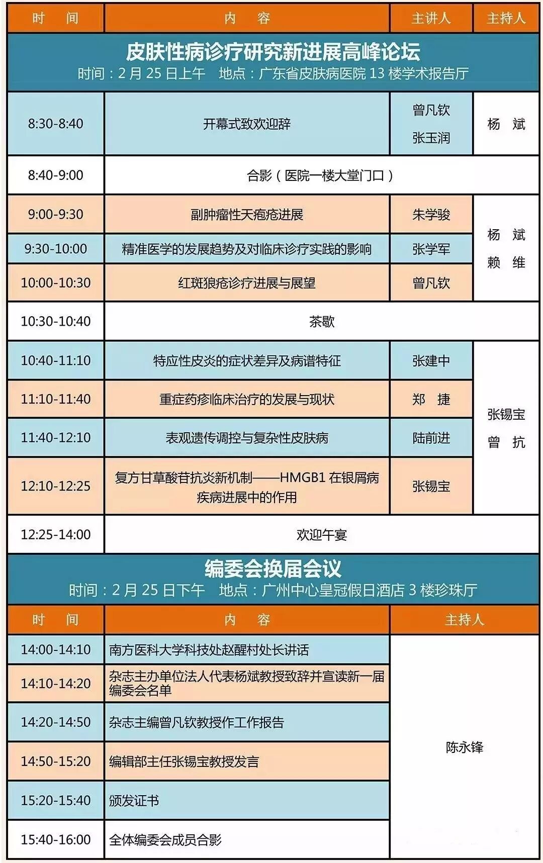 为进一步扩大杂志的知名度和全国影响力,提高杂志的学术竞争力,促进杂志的发展,现定于2017年2月25日举办编委会换届会议,届时将举办皮肤性病诊疗研究新进展高峰论坛,论坛将邀请朱学骏、张学军、曾凡钦、张建中、郑捷、陆前进等国内著名教授作精彩演讲。