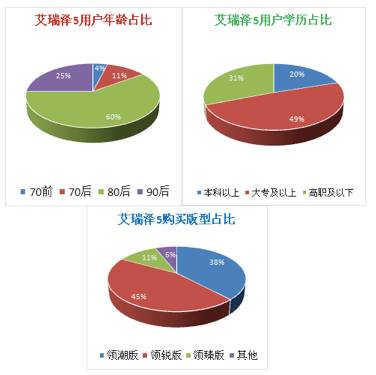 在对艾瑞泽5购车人群的分析还发现,购买艾瑞泽5的用户主力人群在25-30岁之间,以购买自动档、中高配为主,80后车主占比75%,85后用户则高达55%;大专以上学历占比近70%。此外,无论是用户在一、二线城市的分布数量还是女性购车的比例,艾瑞泽5均远超同级竞品。艾瑞泽5的车主已然成为高学历、年轻有活力的新一代车主的代名词。