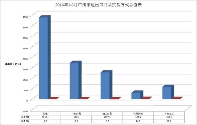 据最新海关统计,2016年上半年,广州市外贸进出口总值3896.1亿元人民币,比上年同期下降0.5%。其中,出口2383.4亿元,增长1.6%;进口1512.7亿元,下降3.8%。单6月,广州市外贸进出口总值693.2亿元人民币,下降14%。其中,广州外贸出口总值419.7亿元,同比下降16.5%,降幅比上月扩大3个百分点;广州外贸进口由增转降,单6月进口273.5亿元,由上月的增长8.4%转为下降9.8%,合计净减少29.7亿元。上半年,广州市一般贸易进出口1726亿元,微增0.8%,加工贸易进出口1277.3亿元,下降9.3%,单月进出口连续9个月下降,6月进出口230.6亿元,同比下降0.2%,比上月收窄7.2个百分点。上半年,广州市机电产品出口1251.8亿元,增长5.3%,增速比前5个月下滑3.6个百分点,出口天然气52.8万吨,增长61.4%,价值20.2亿元,增长19.7%。上半年,广州市机电产品进口653.4亿元,下降7.6%,农产品进口190亿元,增长6.2%。对美国、东盟进出口下降,对欧盟、香港和日本进出口保持增长,对“”沿线国家进出口低迷上半年,广州市对欧盟进出口535.3亿元,增长1.8%,对美国进出口481.5亿元,下降15.1%,对香港和日本分别进出口472.7亿元和387.1亿元,分别增长7%、9.9%;对东盟进出口455.6亿元,下降5.5%,对“”沿线国家合计进出口974.5亿元,下降2.5%。注:,自2015年1月起我国全面发布以人民币计价的海关统计数据。