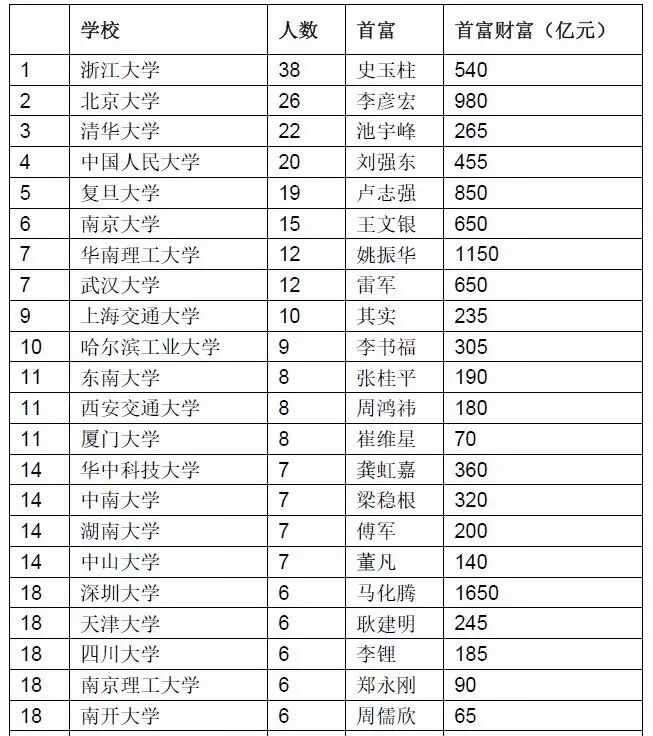 榜单显示,浙江大学以38人排名第一,比清华多16人,北大以26人排名第二,清华以22人排名第三,20人排名第四。胡润表示:“浙大排到第一,在很多人的意料之外,但在胡润百富榜上,浙商人数是最多的。”