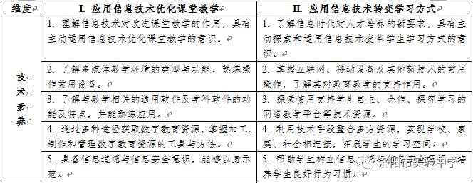 (二)《能力标准》根据我国中小学校信息技术实际条件的不同、师生信息技术应用情境的差异,对教师在教育教学和专业发展中应用信息技术提出了基本要求和发展性要求。其中,I.应用信息技术优化课堂教学的能力为基本要求,主要包括教师利用信息技术进行讲解、启发、示范、指导、评价等教学活动应具备的能力;II.应用信息技术转变学习方式的能力为发展性要求,主要针对教师在学生具备网络学习环境或相应设备的条件下,利用信息技术支持学生开展自主、合作、探究等学习活动所应具有的能力。本标准根据教师教育教学工作与专业发展主线,将信息技术应用能力区分为技术素养、计划与准备、组织与管理、评估与诊断、学习与发展五个维度。