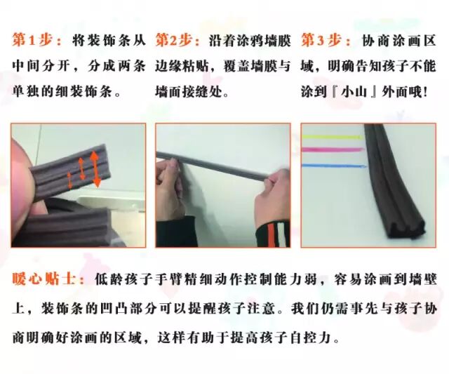 磁力涂鸦墙膜贴上装饰条有两个原因:一是配合家居环境的美观,我们将为大家提供各种材质、图案、色彩的装饰条,使其尽可能的与我们家庭整体的装修风格一致,融入其中;二是避免孩子画到墙壁上。特别是小孩子在自我控制力方面还是在成长中,如果没有阻隔很容易越界画到墙上。提醒一句,我们需要与孩子提前协商好规则,就是边界以外的地方不能乱画,孩子会遵守的。