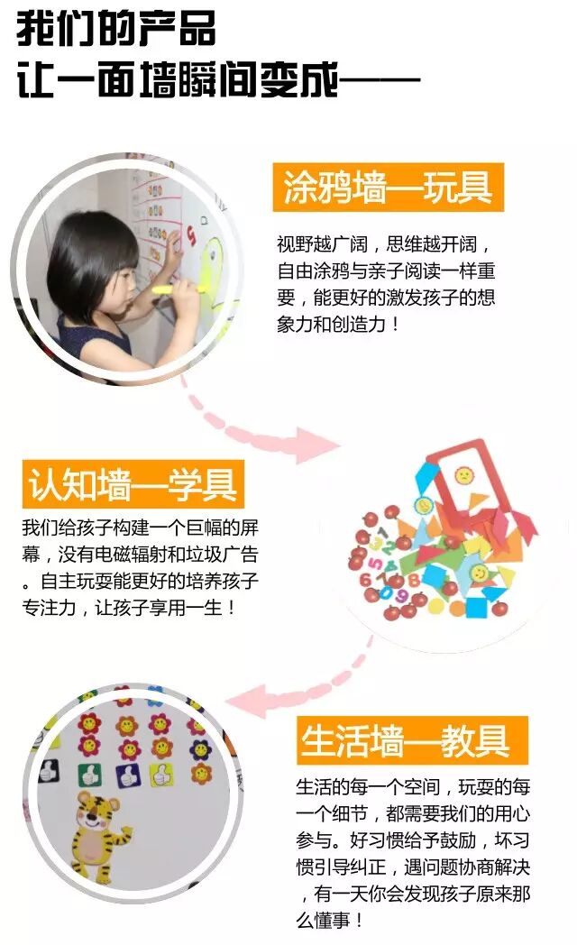 不管是从设计理念上还是涂鸦理念上,他们希望墙膜能把原本光秃秃的墙壁变成玩具、学具和教具,孩子按照自己的想法设计,不必砸钉子,随时可以替换,创造属于自己的小天地。