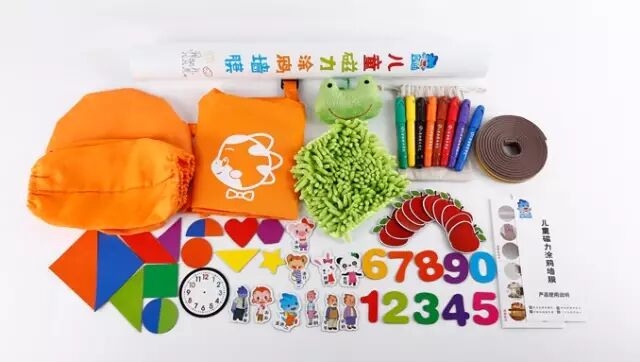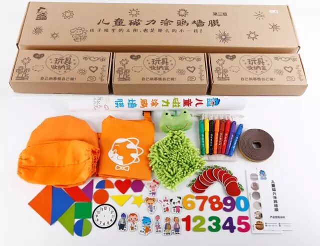 它包括了墙膜、涂鸦笔、收纳袋、画服、磁力玩具、清洁布、装饰条的一整套,可以节省爸爸妈妈好多时间和精力。