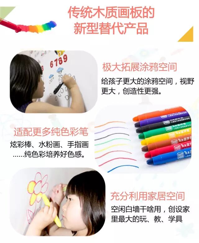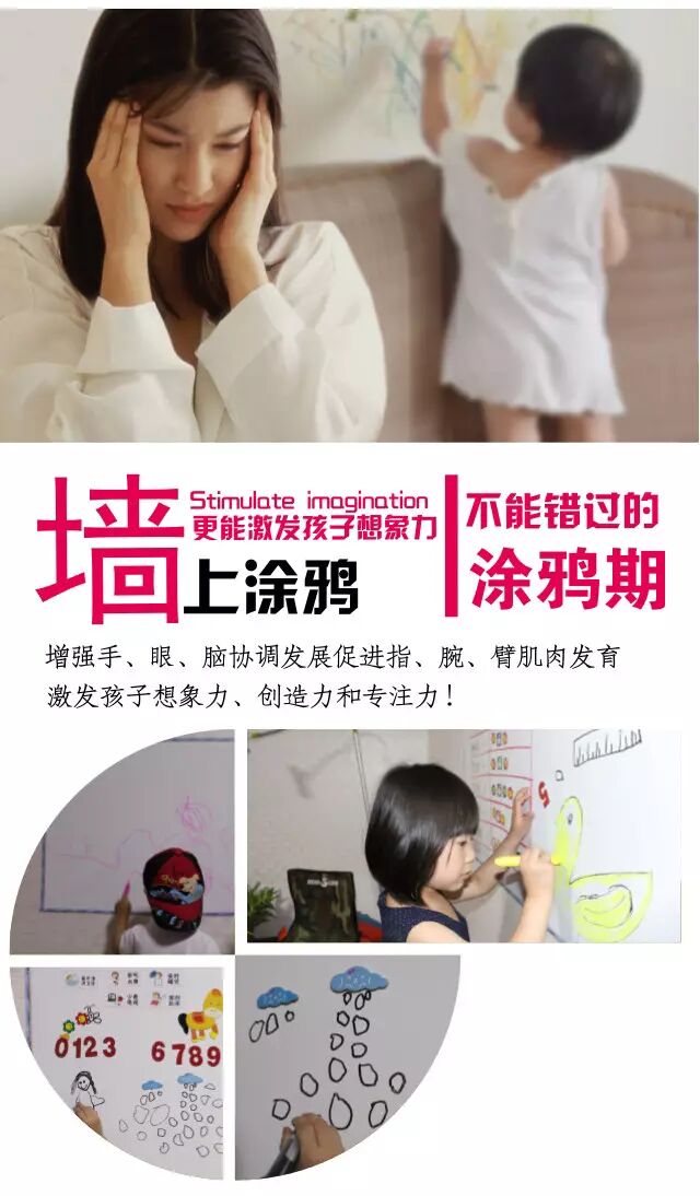 若说画画是孩子的一种天性,那到处乱花几乎是一种必然。不少家长看着家中白白的墙壁被孩子画的乱七八糟心痛不已,于是有些选择断然呵止;有些家长不忍心埋没孩子的涂鸦天性,就在墙壁贴上大大的白纸,告诉孩子画在白纸上,可是似乎孩子的兴趣不仅仅是画画,还有“画在墙上”,于是表面上孩子听话的在白纸上画画,背地里偷偷地越出纸界在墙上留下笔墨,那一笔笔仿佛是一种挑衅;还有些家长为孩子购买画板,可又面临占用家居空间和尺寸有限等问题。