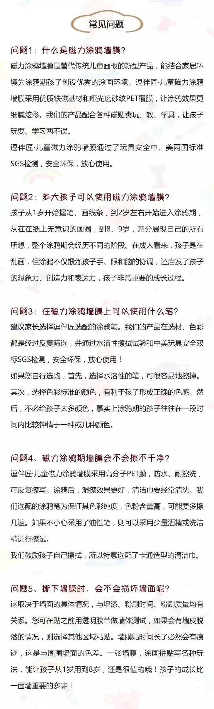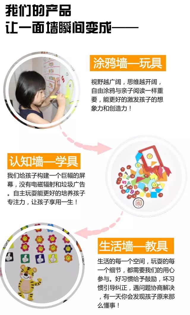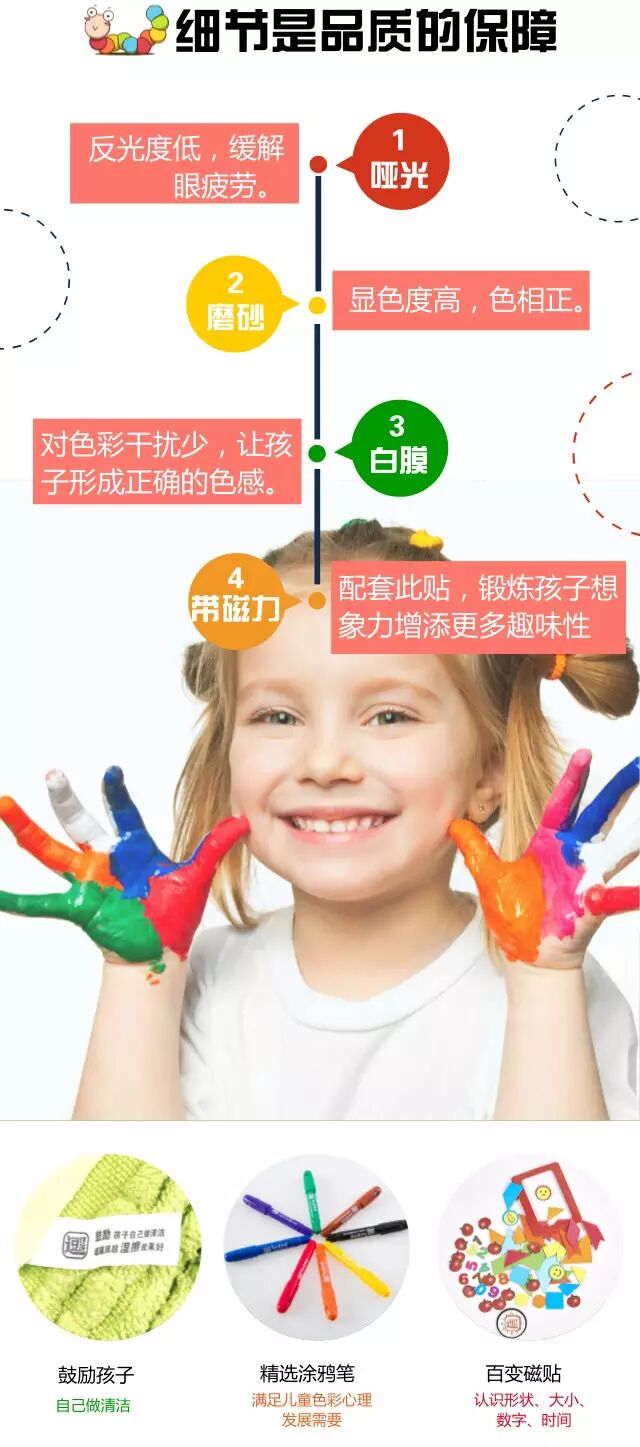 一款品质靠谱,面积足够,实施方便的软白板,一直是我想找到的。它专为涂鸦期的孩子设计,目的是给孩子创设优质的涂鸦空间。墙膜采用PET材质,膜经过特殊处理,既可以反复擦写没有残留,又避免了折射率太高使孩子眼睛疲劳的问题。墙膜本身具有铁磁性,可以配合数字、形状的磁贴学习知识,开发智力,学习玩耍两不误。