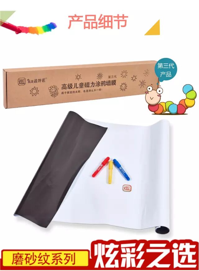 第三代全新升级的套装,在墙膜的厚度、磨砂纹的工艺、涂鸦笔的配方和数量、磁铁配件、装饰条、包装等方面都进行了升级!