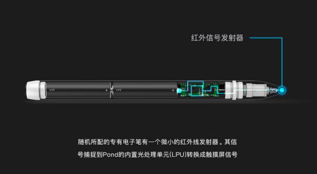 当触控笔内置的微型红外线发射器发出信号时,这一信号会被 Touchjet Pond 投影仪内置的红外摄像头捕捉到,然后经过图像处理器处理之后转化为触屏坐标,从而实现了将投影面转化为触摸屏这一功能。。。