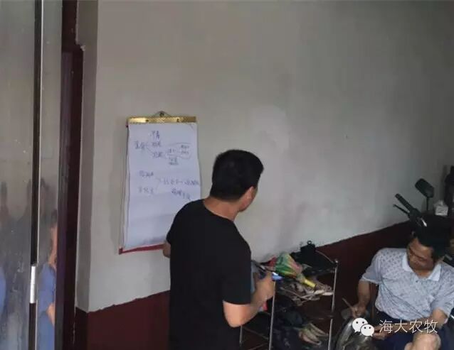 为了错开养殖户农忙的时间,会议时间灵活多变,午饭后,晚饭后,都可见莫师兄忙碌的身影。有时,养户恰好聚集在一个地方,但是又没有提前准备要开会,怎么办?白板笔来解决。莫师兄的包里长期备着白板笔,遇到合适的时间和地点,就临场发挥,用养殖户家里的海大挂历背面做“白板”,进行讲课交流,边说边用笔写下内容要点,这样养殖户理解起来更容易,也保证了方案的执行和落地。养殖户关心的问题比较杂,莫师兄就每天晚上整理区域养殖户的需求,针对近阶段池塘养殖特点,梳理会议思路,提高自己讲课的效率。