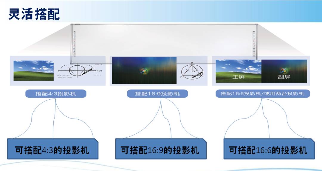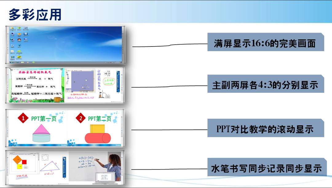 当老师想实现在同一屏中进行PPT的滚动播放(一边播放PPT上一页,另一边播放PPT下一页),达到对比教学的更好效果,而传统的触摸屏和电子白又无能为力时,我们该怎么办?当老师想实现在电子白板上进行触摸交互,又能用水性笔书写批注,还能同步记录下水性笔板书的内容时,我们又该怎么办?"科技就是生产力","创新就会出奇迹"。东方中原不负广大师生的重望,在以创造最好最实用的教学设备回馈教育为使命,以创新为灵感、实用为基础的研发理念下,振撼上市"145"双通道超宽屏白板+16:6的激光投影机的未来教室解决方案"。同时又完美结合教学一体机高集成、易操作、便安装的优势,升级推出"153"双道道超宽屏教学一体机+16:6的激光投影机未来教室解决方案",并如期亮相今年福州的普教展。