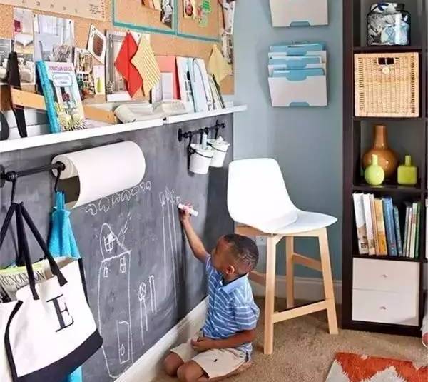 当然啦,妈妈们也可以考虑把多种元素进行组合,比如可以做一个黑板墙,再把涂鸦纸挂在黑板上。