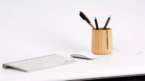 设计师采用原木浆制作而成,底端采取封闭式设计,从底端向上三分之二处对开设计,可以当做笔筒使用;两侧的对开设计还可以成为电线的固定器;同时它还能起到收纳的作用,不会让桌子乱糟糟,保持桌面整洁。