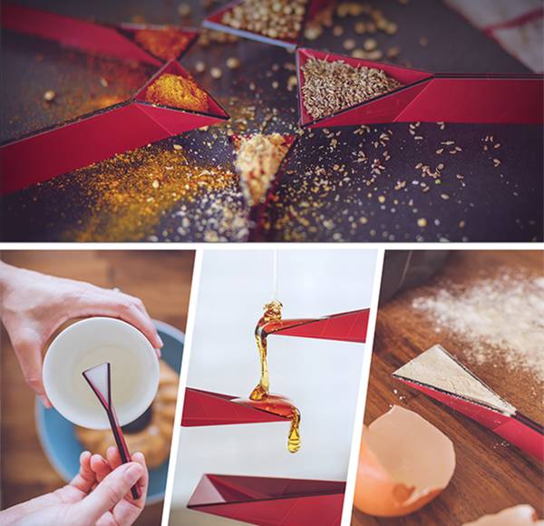 我们印象中精确到克数的勺子应该是圆形长柄,但是你看过平面的勺子嘛?来自印度的设计师 Rahul Agaewal 就改进了量匙,以多边形为出发点,打破勺子以往的造型,在一个平面上面有对应的折痕,不同折痕代表了它的使用规格。