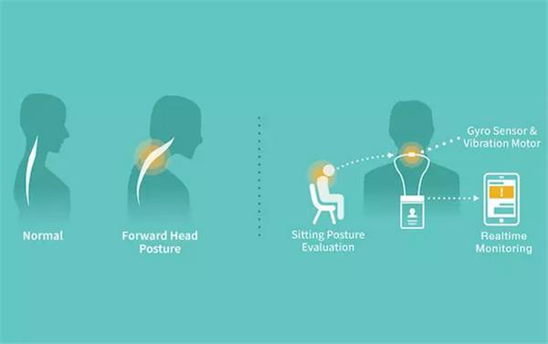 它被设计成卡套的模样,这样上班的时候将门禁卡一同放入,带在脖子上,不会显得异类也不会有负担,并且配置了感应器,一旦感应到用户颈椎向前倾,便会向手机发送提醒。