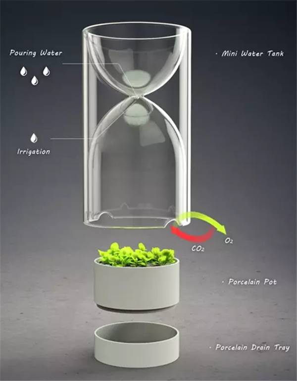 说说因为忘记浇水,你已经养死过多少盆植物了?如果有自动浇水的神器该多好,设计师Jonathan 就以沙漏为灵感,设计了这款桌上迷你沙漏盆栽。