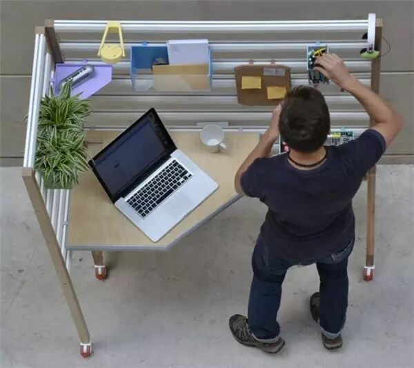 由德国设计师Konstantin Grcic打造的一款「Hack」办公系统,以 OBS 纤维板制作,亮点在于加装在左右两侧的轨道,让桌板可以上下滑动,让使用者可以根据需求调整自己喜欢的高度。