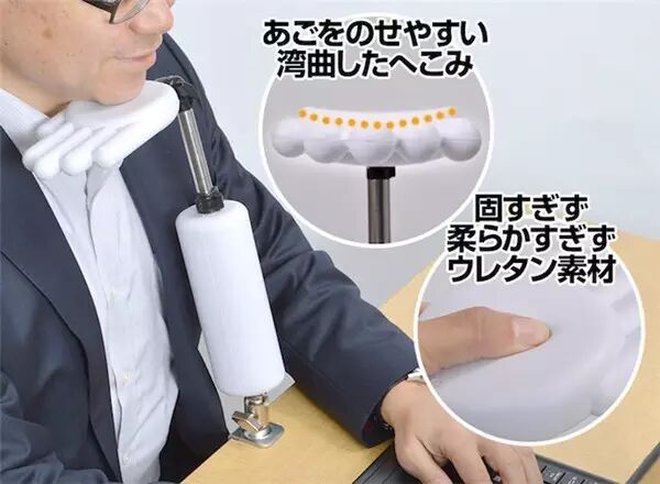 既然要保持身体坐姿的端正,那么借助外力来维持,是不错的方式,不过这支「あごのせアーム 托腮手臂」,可能会跟你想象的辅助器材不太一样...它是一支桌面夹臂,夹在桌面后变成了你的第三只手,并且"手心"跟"手臂"都采用柔软的发泡塑料材质包覆,即使顶住你的下巴强迫你坐正也不至于太不舒服。