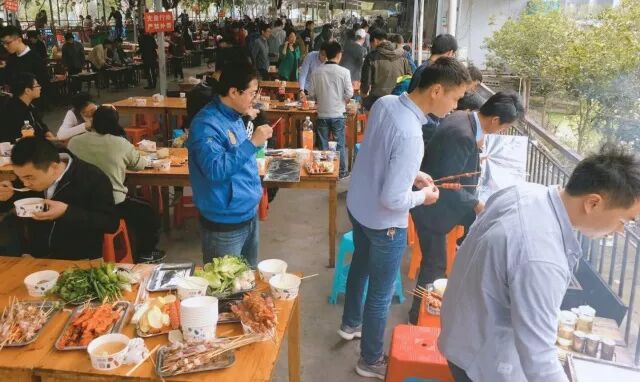还有小伙伴别出心裁,想到按照公司的运作模式,部门之间分工合作:采购员负责采购(拿食物);制造部的小伙伴负责生产(烤肉);品保部的小伙伴负责检验(品尝)。真实还原了日常上班时的工序,不得不说,还真像那么回事儿。