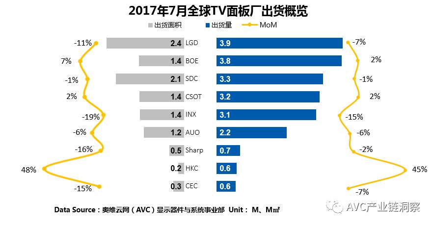 奥维云网(AVC)显示器件与系统事业部《DDS-全球TV面板出货月度数据报告》显示,2017年7月全球TV面板出货21.2M,同比下降2%,环比下降3%;出货面积10.8M㎡,同比下降1%,环比下降6%。