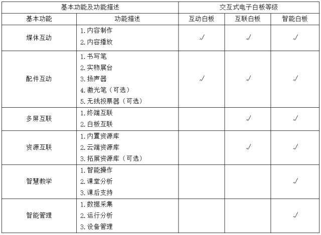 依据交互式电子白板教学功能从简到繁,《交互式电子白板 教学功能》提出将交互式电子白板分为三级:互动白板、互联白板和智能白板。