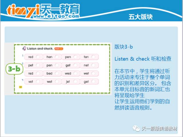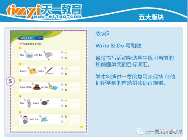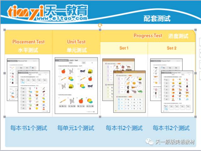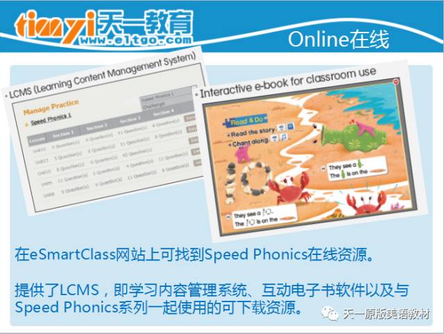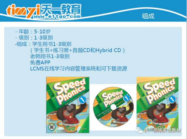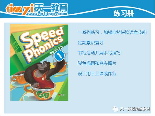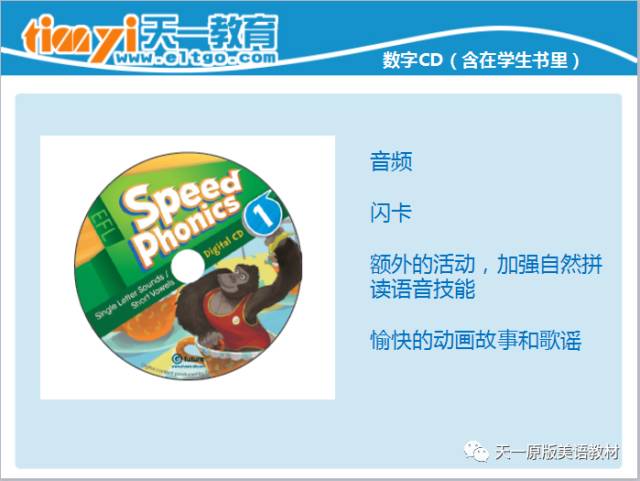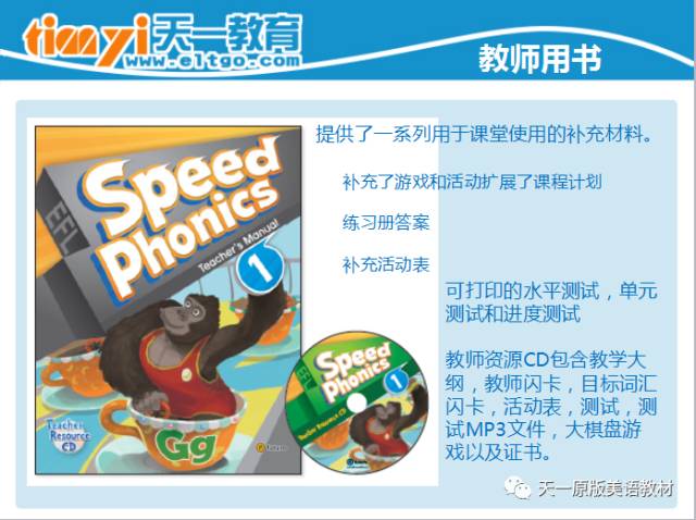 每个级别配有一本教师用书,书里有教学指导及练习册答案。重要的是书中附带一张教学白板软件。软件包含电子书功能,歌曲教学环节,故事教学环节,游戏教学环节,图文卡等内容。软件需要在网络下使用,同一个帐可多名老师同时使用