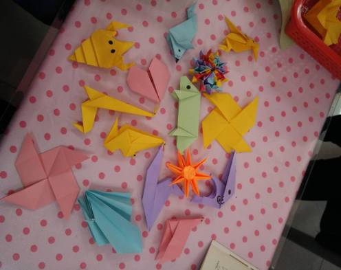 本次活动由教研组长刘顺云老师负责,刘老师首先跟大家介绍了一些简单的折纸知识,然后直接进入主题。本次培训她以“双菱形”的变化为重点学习内容,现场手把手交给老师们由双菱形开始变化折出的各种动物。她采用边讲解边示范的方式,由易到难进行折纸教学;还通过作品向老师们进一步讲解了折纸的基本技巧、步骤、造型等,如:立体花朵、鹦鹉、小船、袋鼠等等。让大家一起体验了“玩中学”的趣味折纸活动。