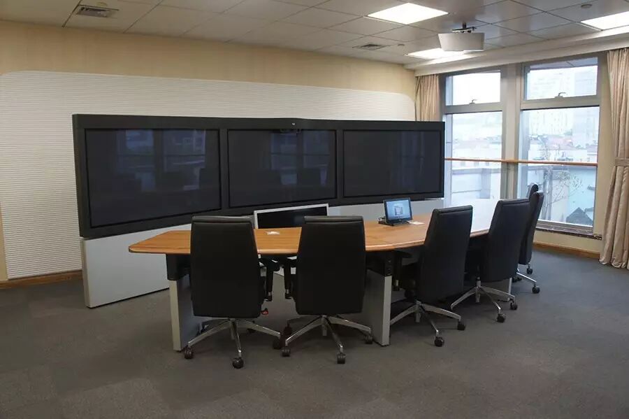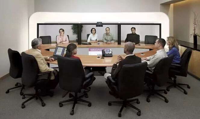 “圆桌会议”的交流方式:网真系统可提供“多点分屏会商模式”,即每块显示屏显示不同地方的与会者。因为每个会场的装修环境、背景墙等都相同,可产生各方同处一室、身临其境的感觉。