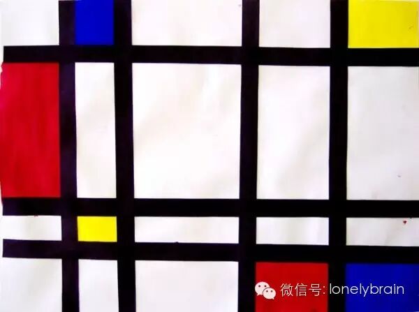 格子画线条抽象,色块的填充和直线交错,简简单单的红黄蓝和大大小小的格子组合在一起给人强烈是视觉冲击,构成感十足。图像富于变化,简洁明了。蒙德里安努力探寻比例与分割的关系,设计格子的形状大小,色彩搭配,做到画面的均衡和美感,又不乏秩序与理性。