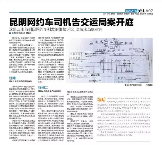 昆明女司机谭小英,去年5月11日通过“滴滴”网约车平台接单送乘客时,被昆明市交通运输局交通稽查人员当场逮住,暂扣车辆,罚款两万元。谭小英不服,将昆明市交通运输局告上法庭,要求撤销对她的行政处罚。今年1月5日上午,,确认昆明市交运局对谭小英所作出的交通行政处罚决定违法,滴滴司机胜诉。双方是否上诉,目前不得而知。