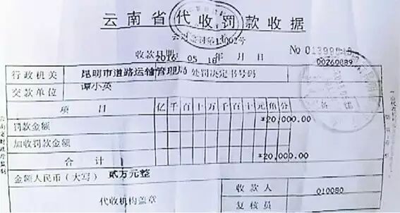 5月18日,昆明市交通运输局作出交通行政处罚决定书,认定谭小英非法营运,并依据《云南省城市出租汽车管理办法》,罚款两万元。