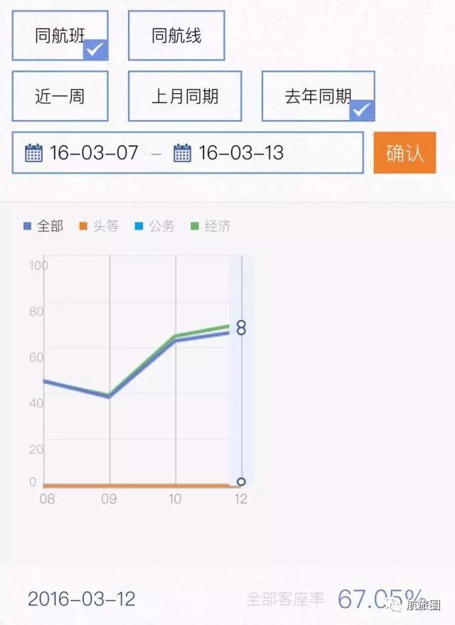 (滑动图片翻看A航班近一周、上月同期和上年同期的客座情况)