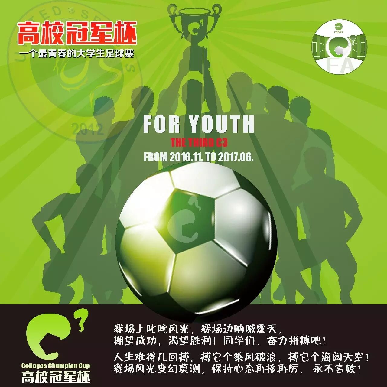 2016-17第三届广东省“高校冠军杯”大学生七人制足球赛预选赛暨巡回积分赛(从化站) 截稿前,仍有4个名额待新球队报名!已报名球队有:广州工程职业技术学院,广州华夏职业学院,广州城建职业学院,广东水利电力职业技术学院,可报名额4个。按章程规定,发稿后48小时内,如新球队未报满,将按顺位录取预约报名的学校。请同学们相互广播知悉!还等什么,从化以及从化周边的学校赶紧按下面的报名方式来报名啦。