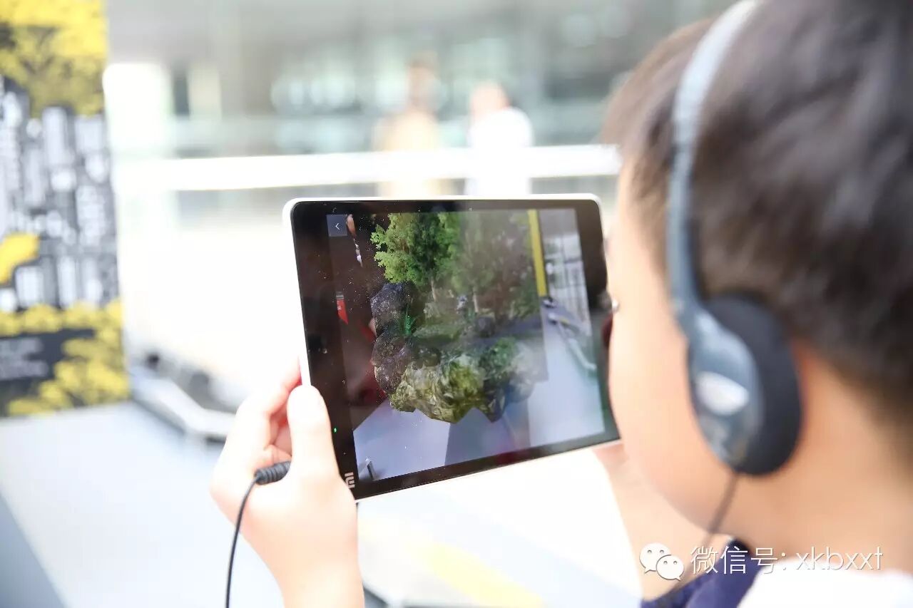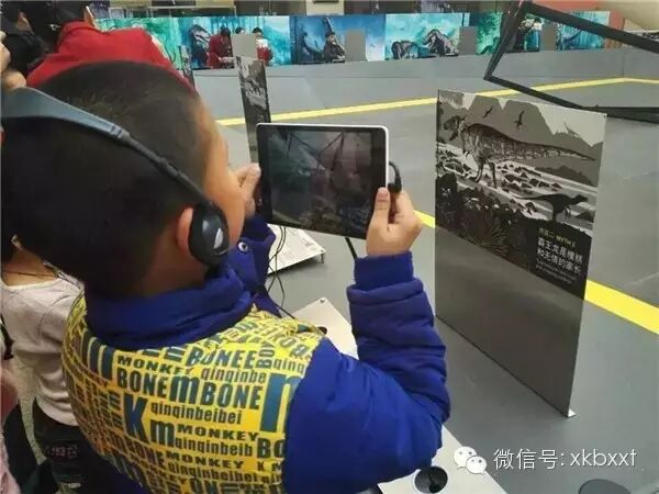小朋友们在展区四周戴上耳机,用设置好的平板电脑扫描模型或各种标志板,就能通过AR技术亲眼看到恐龙“复活”,甚至“跳进”现场的真实方框,觅食、嬉戏。