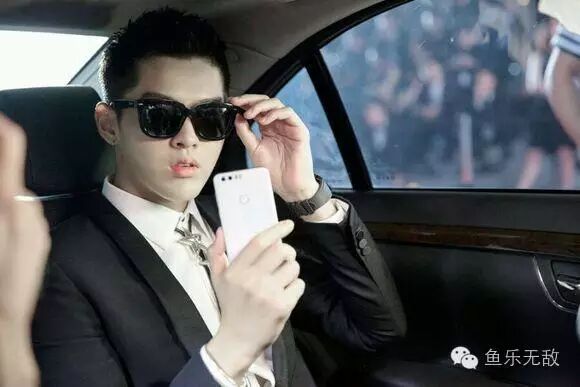 吴亦凡一身黑色商务西装,配饰墨镜,手拿华为荣耀8手机,这样看起来更加的有范。同时也有点上海滩的感觉!