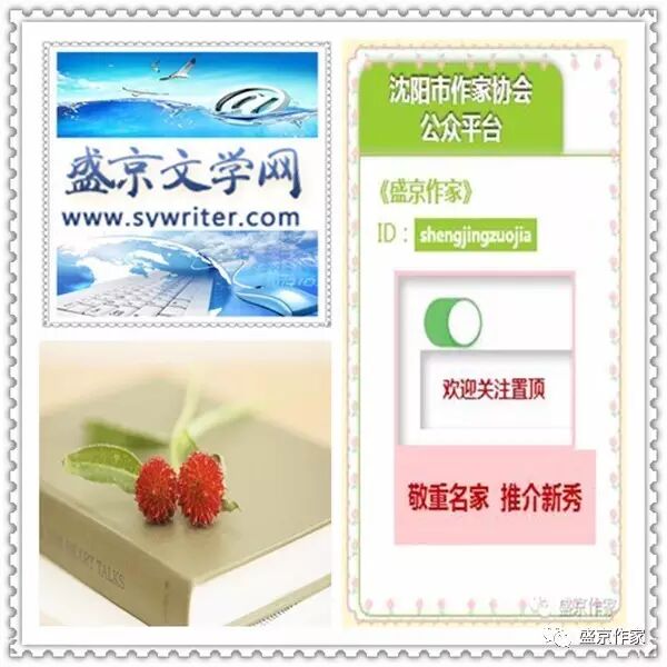 《盛京作家》由沈阳市作家协会官方认证的公众微信平台!关注“盛京作家”精彩分享。微信平台每天及时发布原创作品、文坛资讯、名家欣赏、作家及新书推介、成就展示、文学营销等栏目会及时更新。欢迎广大读者与作家关注!同时期待您的文学作品及成就,在此微信平台上展示与推介。