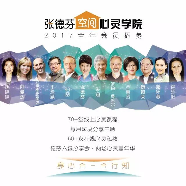 不管你有没有许愿,每个人或多或少都想在新的一年有新的变化。2017年,我们希望大家都能活得真诚、自在一点儿,张德芬空间为此筹备了一所心灵学院,它是属于大家的,为尽可能多的人打开成长的便利之门,让每个走向心灵成长的人都能够很容易就参与进来,因此我们设置了“线上+线下、系统多元、深度参与”的形式。