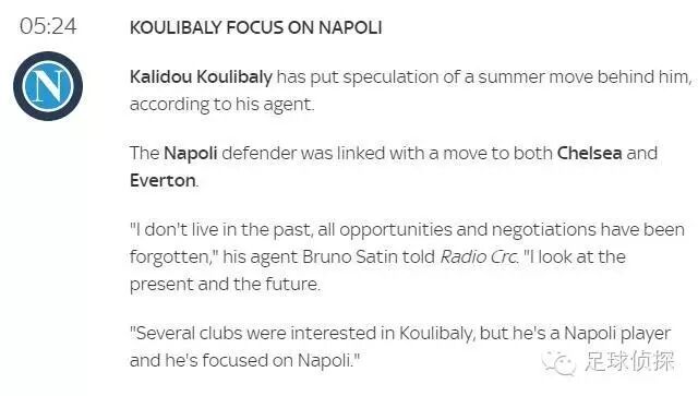 这名那不勒斯后卫曾传闻将加盟切尔西或者埃弗顿,不过他的经纪人布鲁诺-沙丁告诉CRC电台:“我不会只活在过去,所有的那些机会以及谈判都已成为过去,现在我只关注当下以及未来。之前的确有很多球队对库利巴利感兴趣,不过他现在是一名那不勒斯球员,而他专注于效力那不勒斯。”