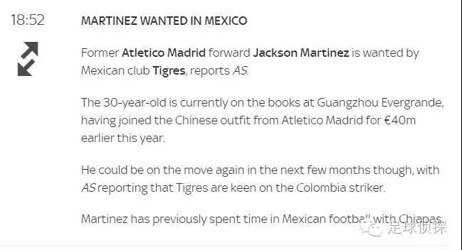 30岁的马丁内斯目前效力于中超豪门广州恒大,今年早些时候他以4000万欧元左右的价格从马竞加盟。不过,报道称马丁内斯未来几个月可能会再次踏上转会之路,阿斯报表示老虎队非常希望签下这名哥伦比亚前锋。