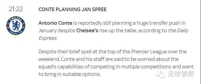 报道称尽管上周末蓝军曾一度登上积分榜榜首,但是孔蒂和他的团队还是对球队目前多线竞争荣誉的能力感到担忧,据悉切尔西希望在一月份带来几名合适的新援。