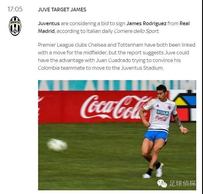 报道称,英超方面切尔西和热刺都传闻可能会对j罗采取行动,不过罗马体育报表示尤文可能会在求购哥伦比亚人的交易中占有优势,因为尤文队中的哥伦比亚球星夸德拉多可能会出面说服他的国家队队友加盟斑马军团。