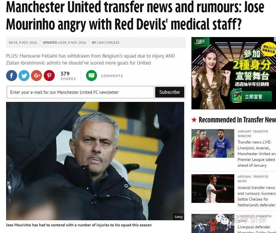 ,穆里尼奥对曼联医疗团队的工作感到愤怒,因为曼联现在正经历伤兵满营的情况。