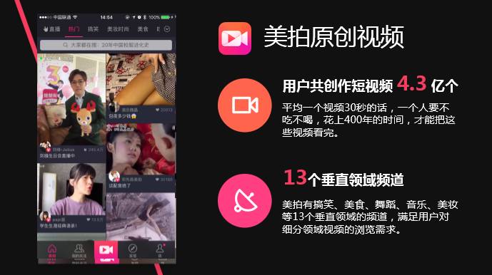 截至2016年6月30日,美拍用户已经上传超过了4.3亿个短视频,足够一个人连续观看400年时间。以原创短视频社区构建力见长的美拍在今年1月推出直播功能,并参与了戛纳电影节等重大事件直播。截至2016年6月,已有超过10000名网红、750位名人和1000个公共组织选择通过美拍与其关注者、公众交流。根据艾瑞咨询报告,中国约62.4%的短视频平台用户将美拍列入其最喜爱的三款短视频平台之一。