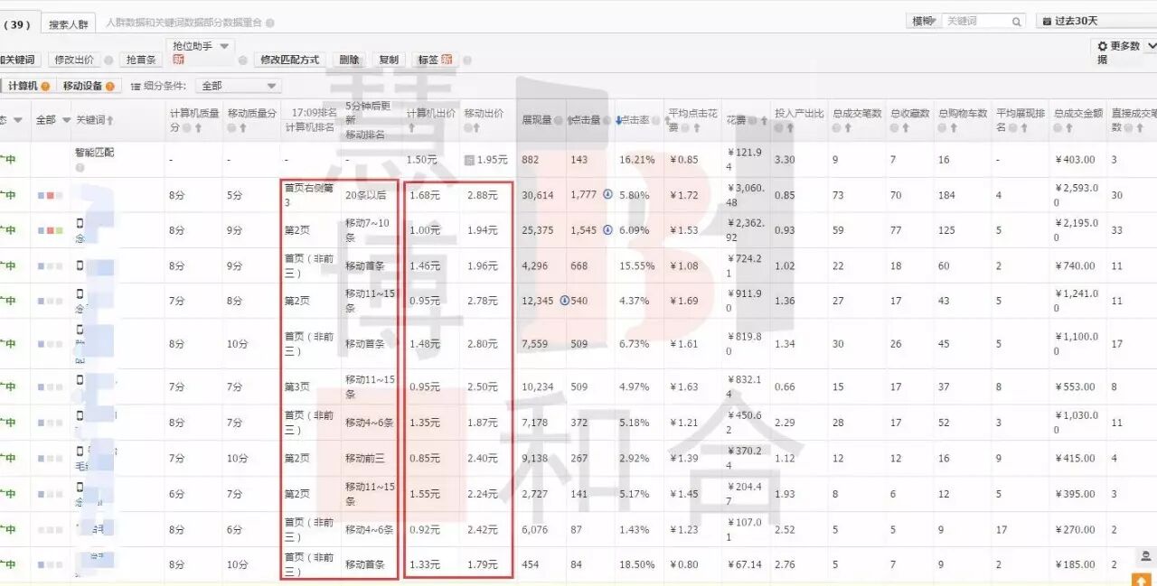 出价:关键词扣费方式为下一名出价*下一名质量得分/我的质量得分,根据这个公式,前期我们需要提高自身的质量得分,在店铺内功完善好的情况下,点击率是首要因素,对于小类目的关键词出价,在保证出价不是很高的前提下尽量往前卡位,对于行业展现特别大的关键词出价排名在11-15或16-20,对于行业展现词不是很大相对精准一些的关键词出价排名在4-6或7-10,卡前边的关键词点击率一般也相对好一些。
