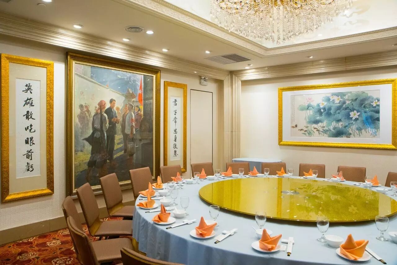 房间也是够气派,到处挂放着毛笔字画,巨型的水晶吊灯与花纹地毯让环境显得尊贵不凡,带亲戚朋友来这儿用餐,妥妥的面子。