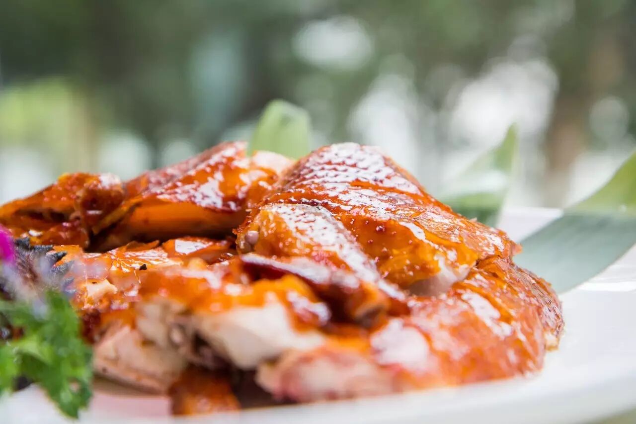 先把鸡用蒜汁腌制,上好糖浆,风干后拿去炸。成品颜色鲜亮油红,味香皮脆,绝对是经典之作。
