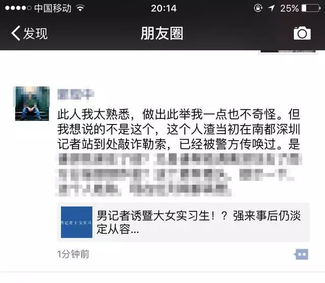 据“新媒体女性”称,多名记者表示,他进入《南方日报》,是因为在南都深圳站敲诈事发。