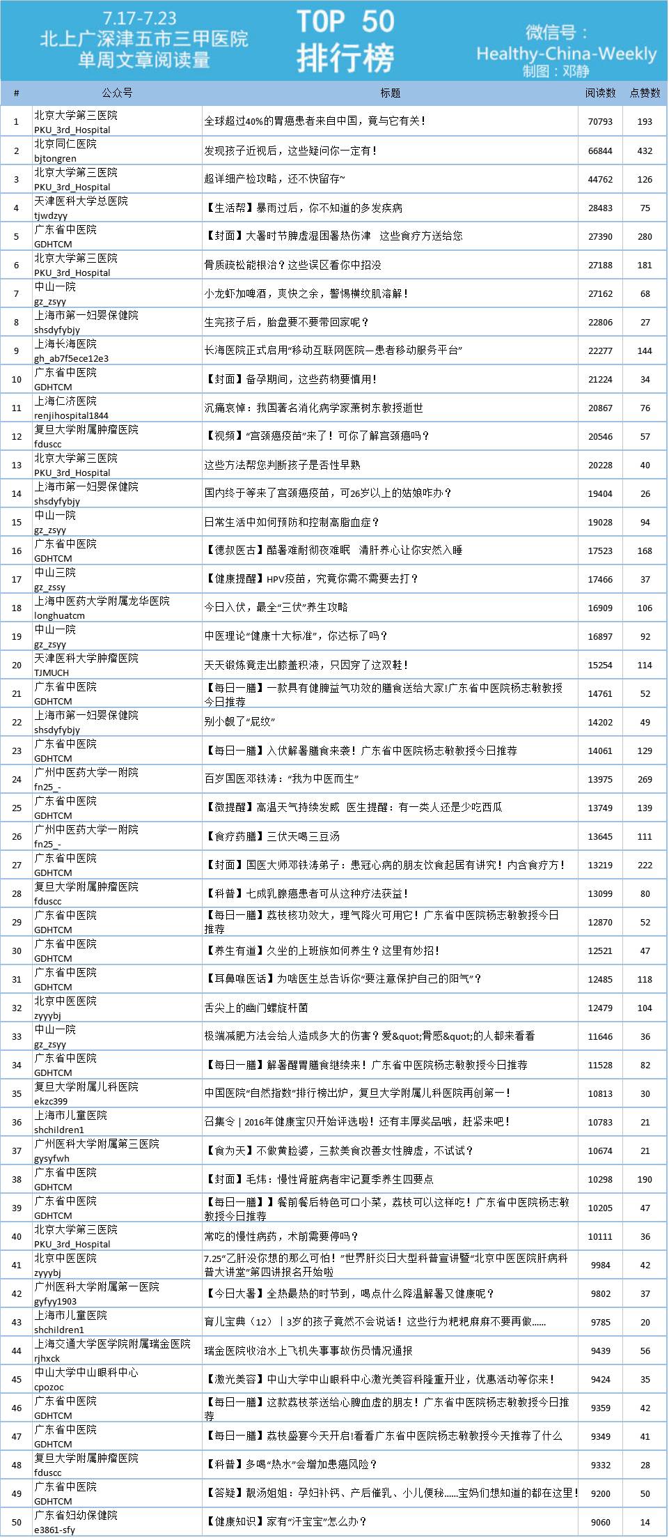 微信公众号已成为一线城市三甲医院传递信息、提供便民服务的重要渠道,其影响力不容小觑。为评估一线城市三甲医院微信公众号影响力,从2016年3月28日开始,健康中国周刊每周推出一线城市三甲医院的微信公众号综合影响力前50强排行榜,本周起将推出这些公众号最热门能到文章50强,供各家相互学习,未来我们将逐步推出全国三甲医院微信公号影响力榜单。