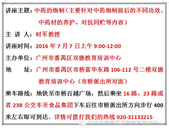 番禺教学点(广州双德教育培训中心)作为广州中医药大学唯一指定的教学点,从2015至2016我们教学点在读生已有600多人,为了感谢社会各界人士对我们教学点工作的支持和帮助,我们有幸邀请到了时军教授为大家安排一次专题讲座——《中药的炮制》,希望您能在百忙之中抽出时间前来参加: