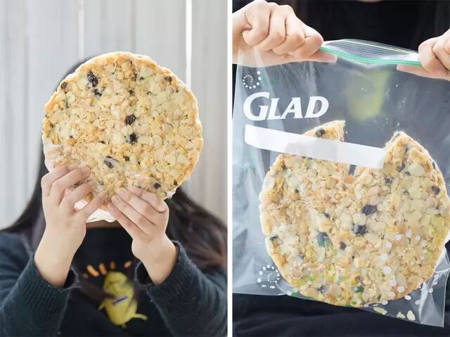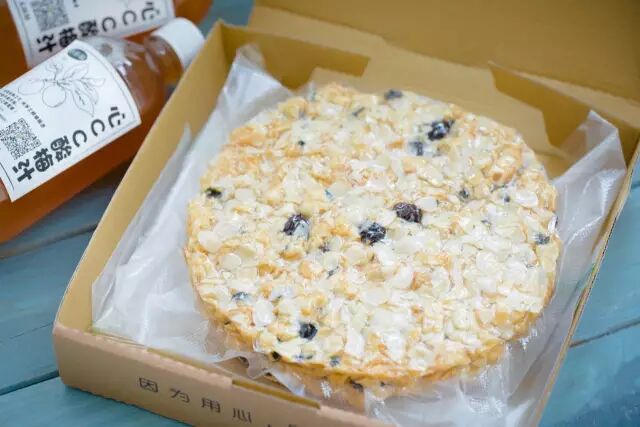 大份足料是它的标签。光直径就有22cm长,厚度3cm,4部Iphone6也没它厚!这大脸沙琪玛,足够5-7人食用。壕版沙琪玛,海苔、芝麻、花生、杏仁片,加上草莓干、黑加仑提子干,收下我的膝盖吧,太壕了!
