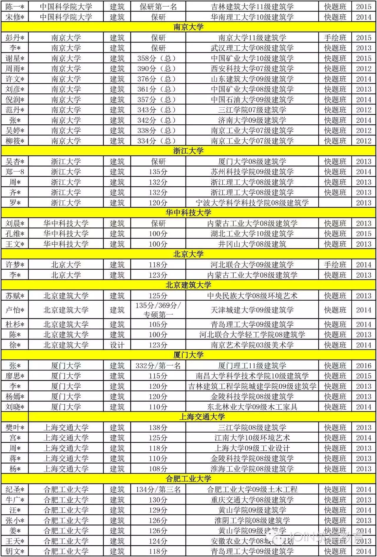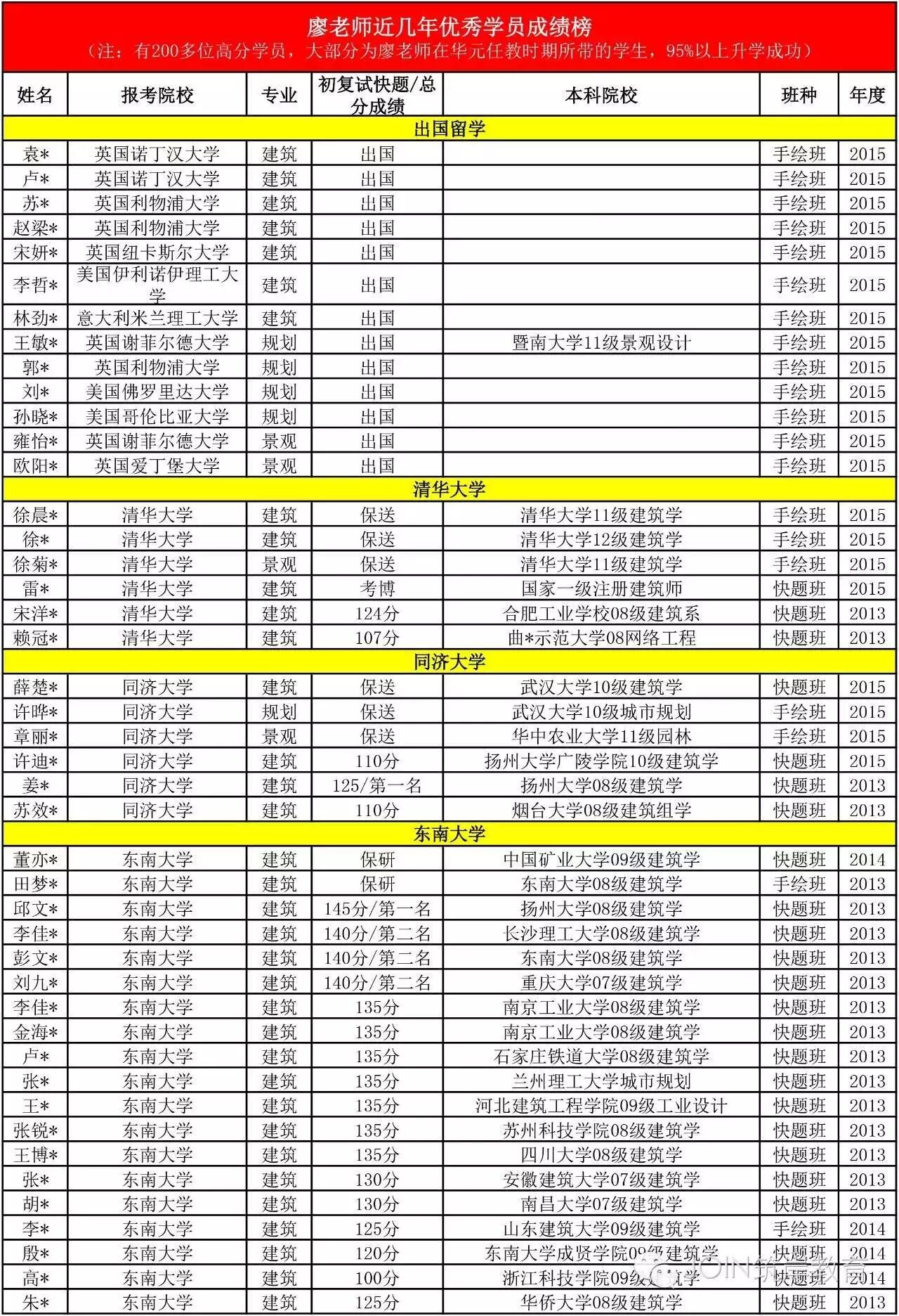 廖老师历届学员有500多名考上国内名校,其中有200多名为高分学员:1. 姜 * 2013年 同济大学建筑考研快题第一名